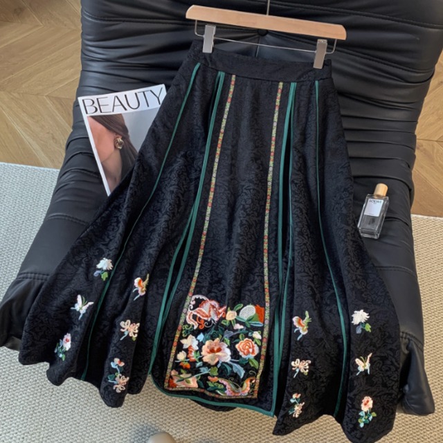 落ち着いた色合いの中に、繊細な花柄刺繍が映えるAラインスカートです。