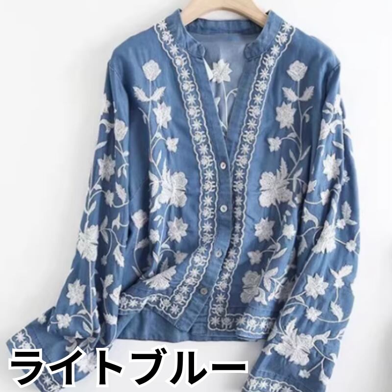 カジュアルながらも女性らしさを演出する、刺繍入りシャツ。