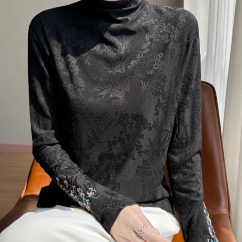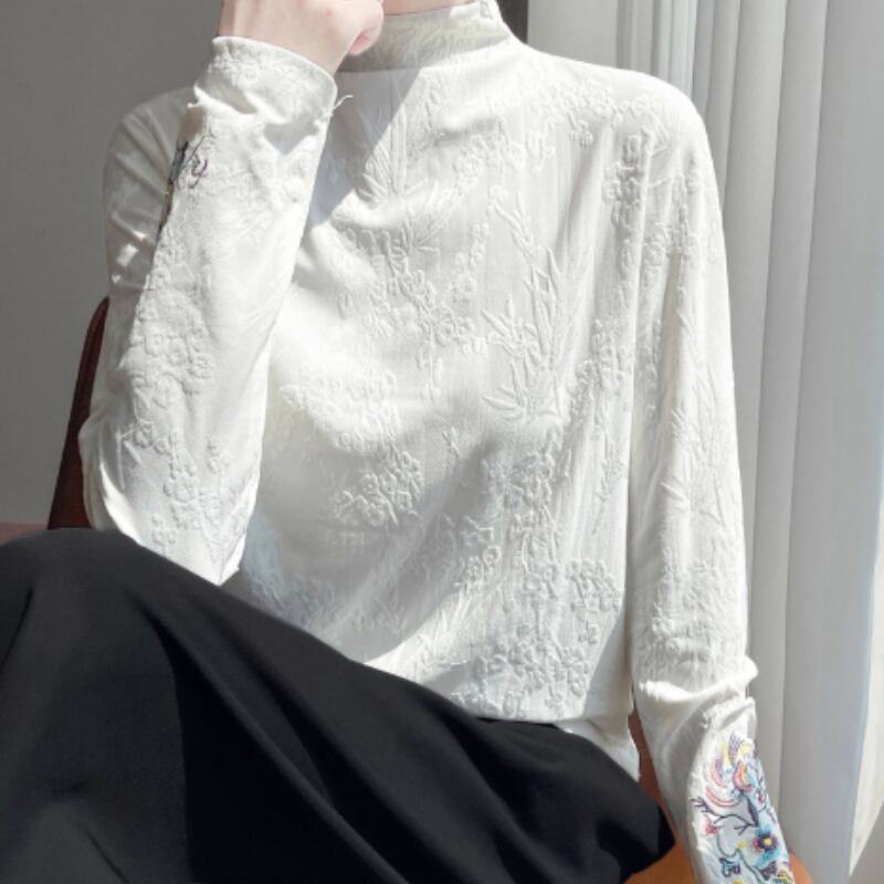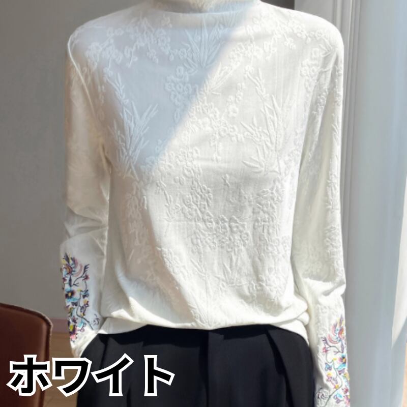 繊細なエンブロイダリーがポイントの、ハイネック長袖カットソー。
